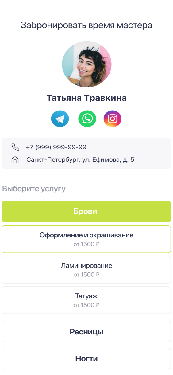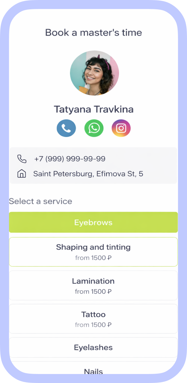 During platform registration, a professional can fully populate their profile: showcase work examples, list social media, and specify their address on the map. This helps clients quickly choose a suitable professional.