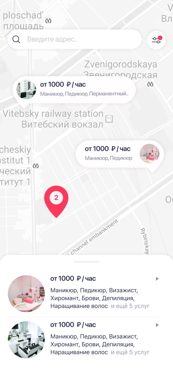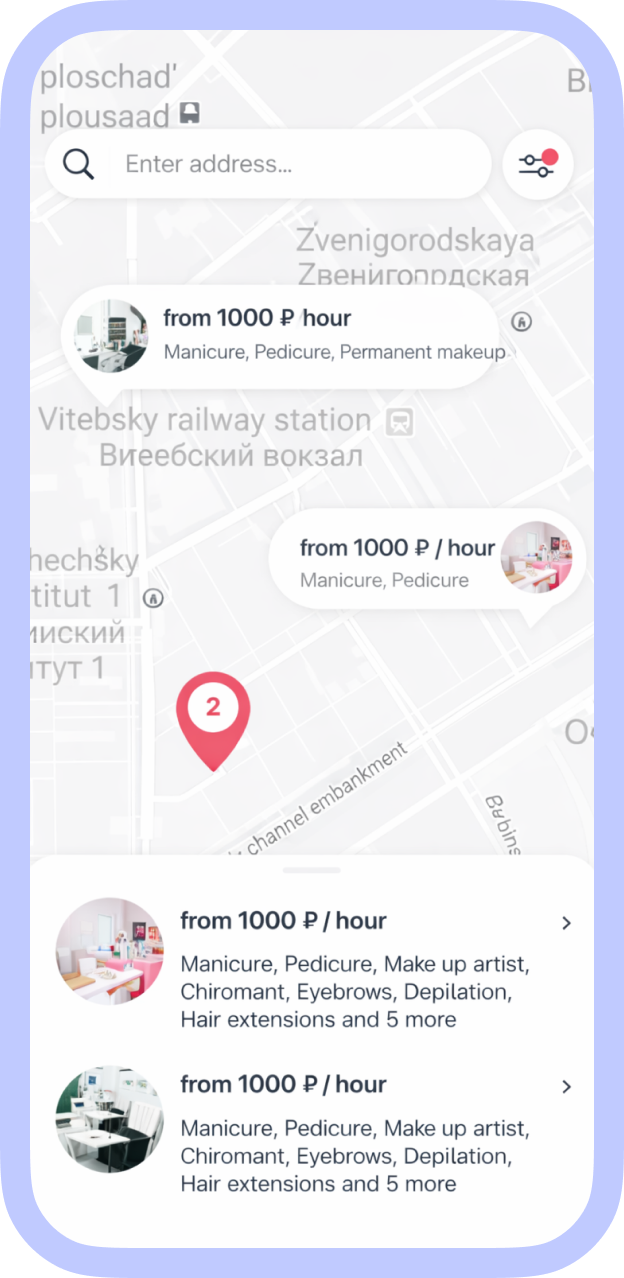 Clients can easily find professionals by service type, name, or address. Filters enable quick search, for example by price range. We also integrated Yandex Maps to find nearby professionals.