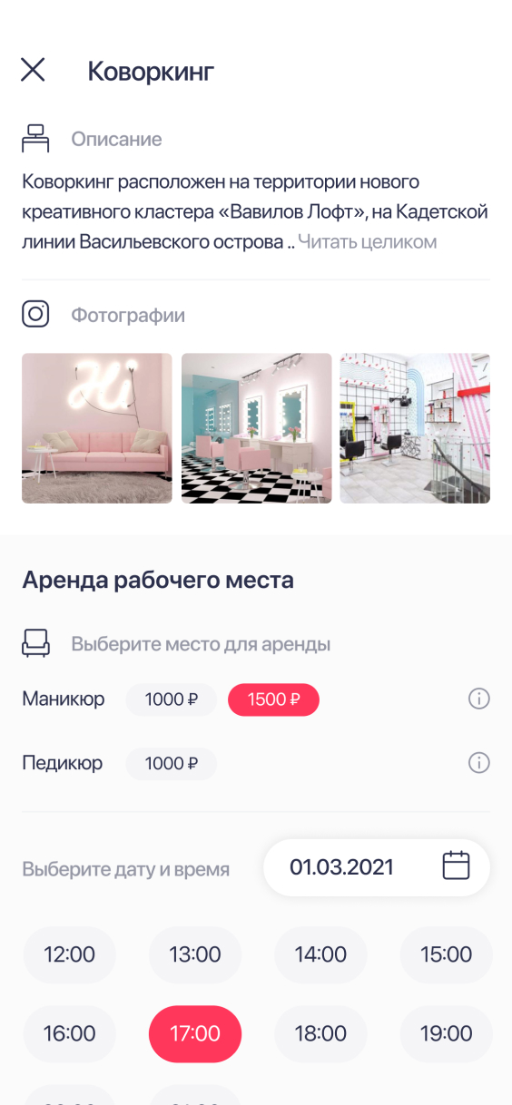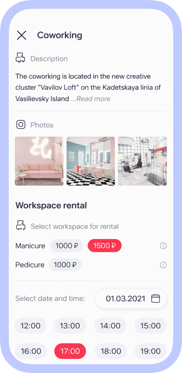 Often, professionals manage appointments in phone notes or small slips that frequently get lost. A convenient tool was needed for scheduling and renting out coworking space spots.