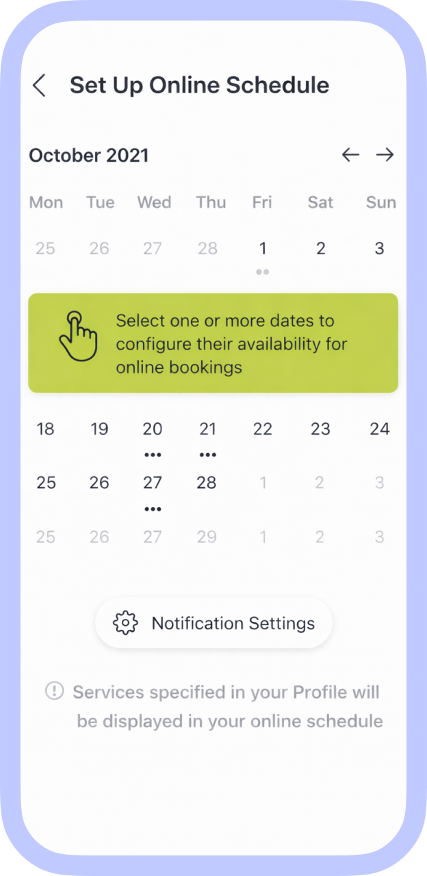 When choosing a professional, clients immediately see available time slots and select convenient times.